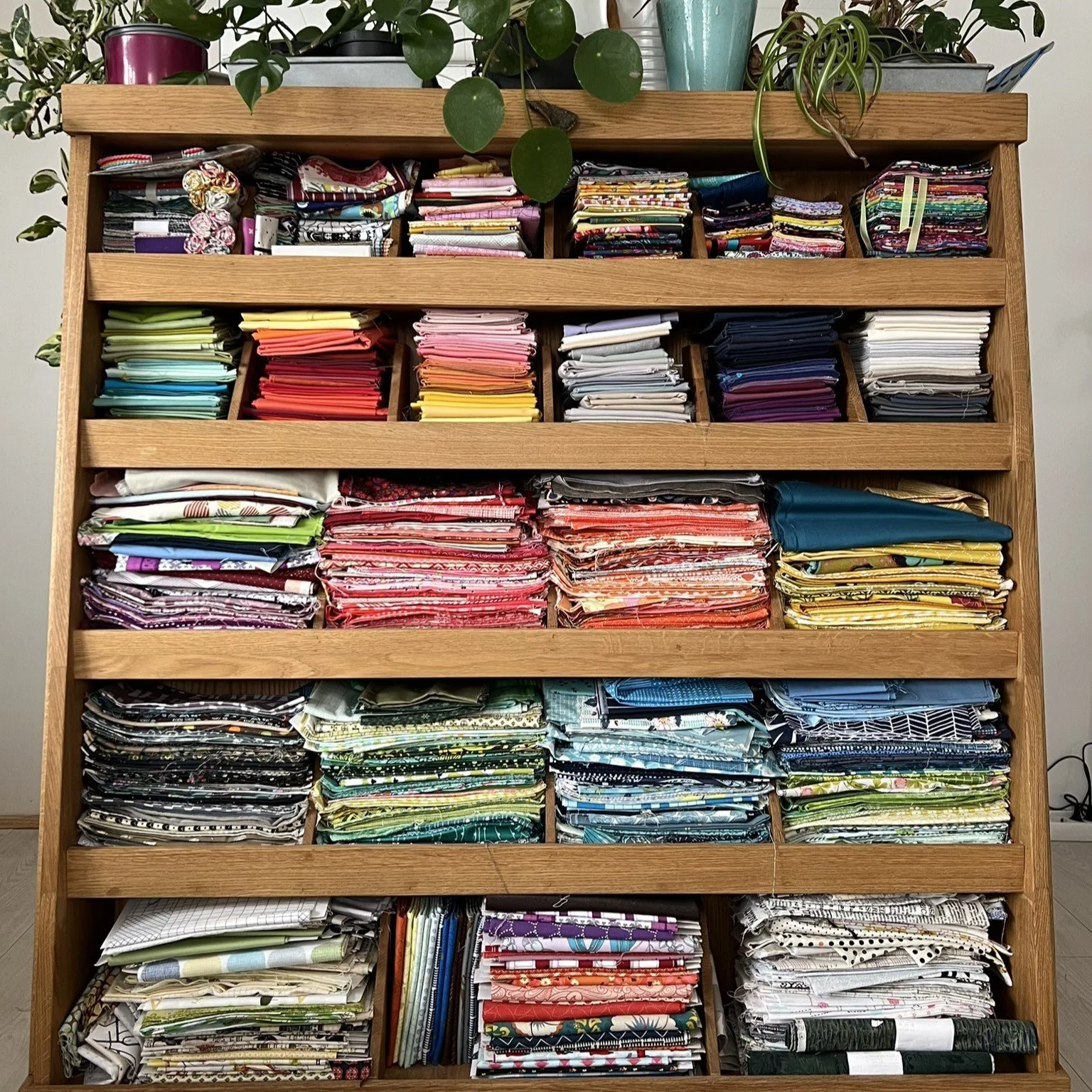 “A friend saw this wooden shelving unit on the used marketplace in Oslo and insisted it would be a good fit for my fabric. She's right, and it's been so convenient to see what I have when I'm pulling fabric for a project.”