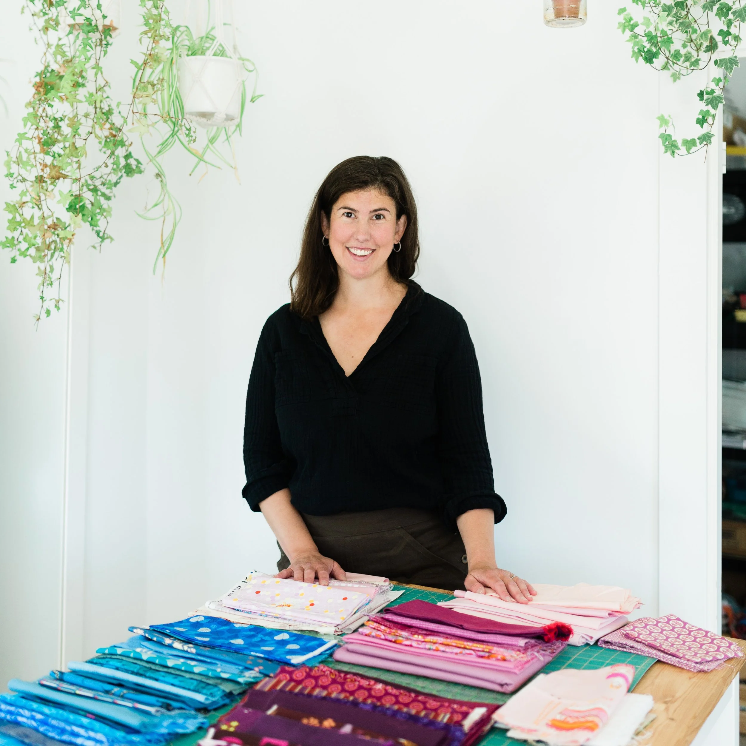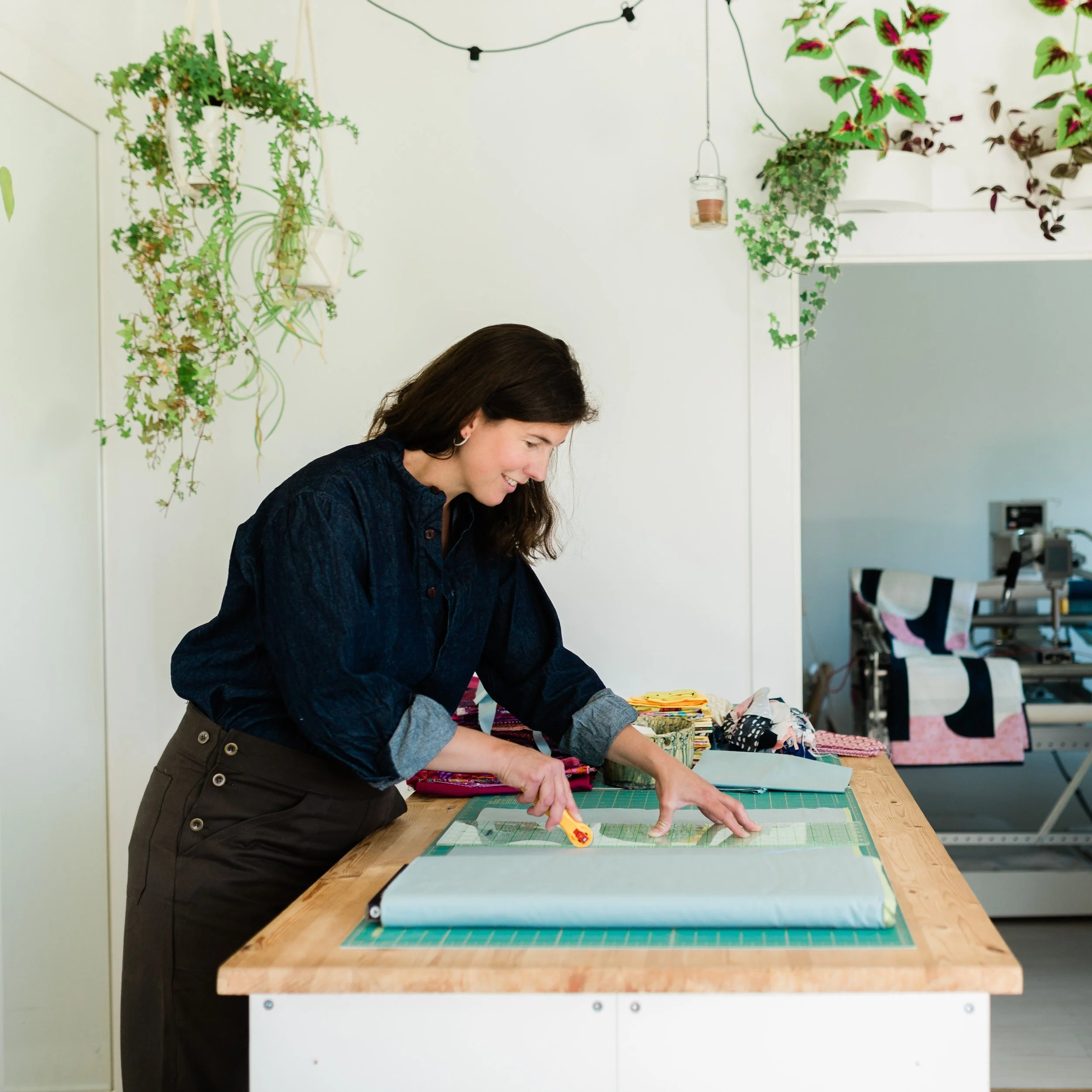 I have two big tables on wheels that give me a generous work surface but can easily be rolled aside when I need to trim or square up quilts on the floor. There’s also a separate workshop on-site that holds a laser cutter and my husband’s woodworking tools — it’s a good balance of sawdust and stitches. My own studio is filled with plants and color, and I try to store fabric in ways that keep it visible. If I can see it, I’m more likely to use it. It’s a space that keeps me grounded and inspired, with just enough room for creativity (and chaos) to coexist.”