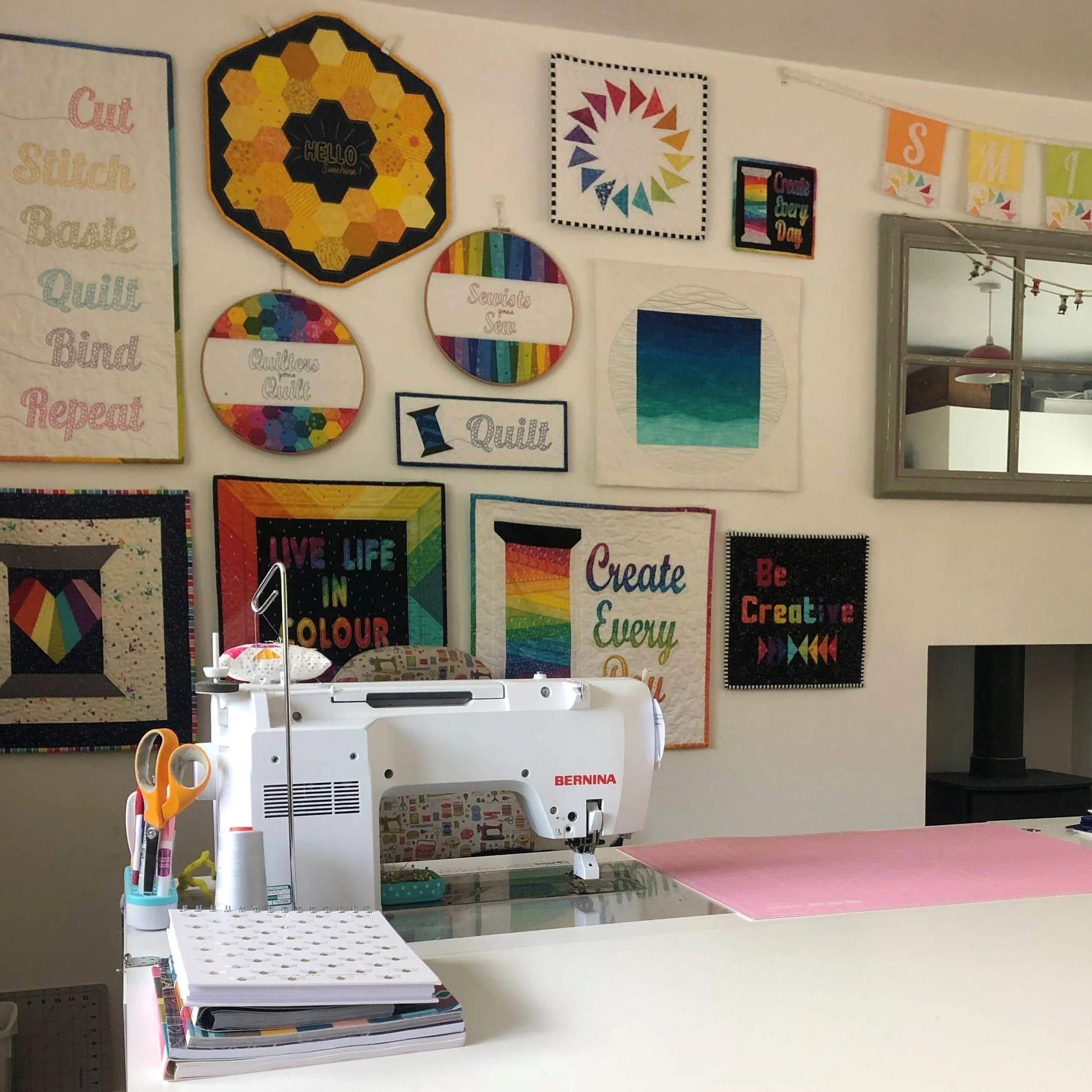 “I feel really fortunate to have a dedicated sewing space in my home. It’s a large room which used to function as our family room, but now it’s my workspace. Having a 1 minute daily commute to work is wonderful! It’s a beautiful bright room with bifold doors at one end leading to the garden and a window at the other. The white walls are decorated with bright rainbow mini quilts. Despite being large I have crammed a lot in!