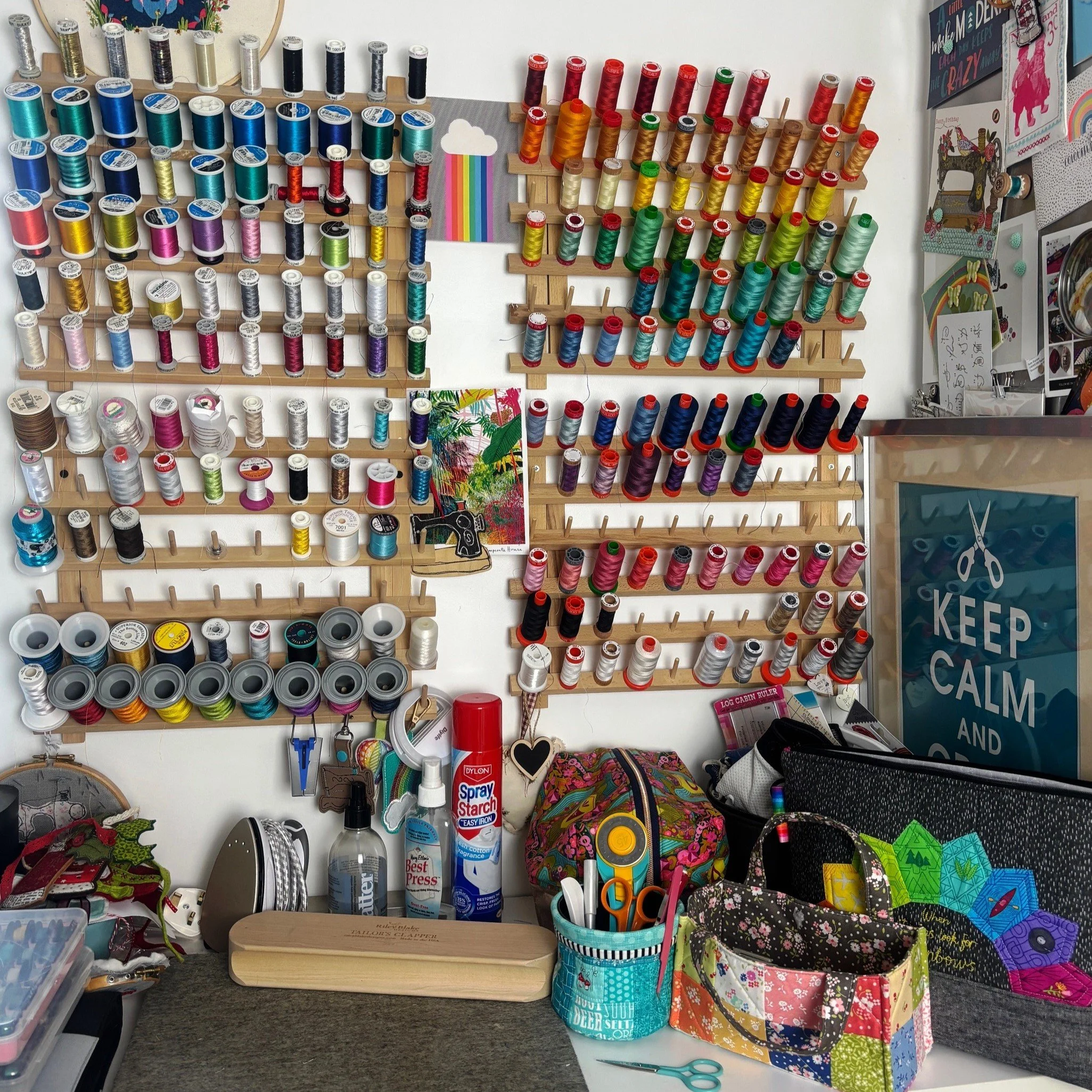 “Keeping my thread visible and on the wall, means that it adds to the colour decoration in my room! It's in a corner of the room that never gets sunlight so it's protected from sun damage. I've recently arranged it with all my rayons, metallics and polyesters on the left. On the right are all my Aurifil cottons arranged by rainbow colour.